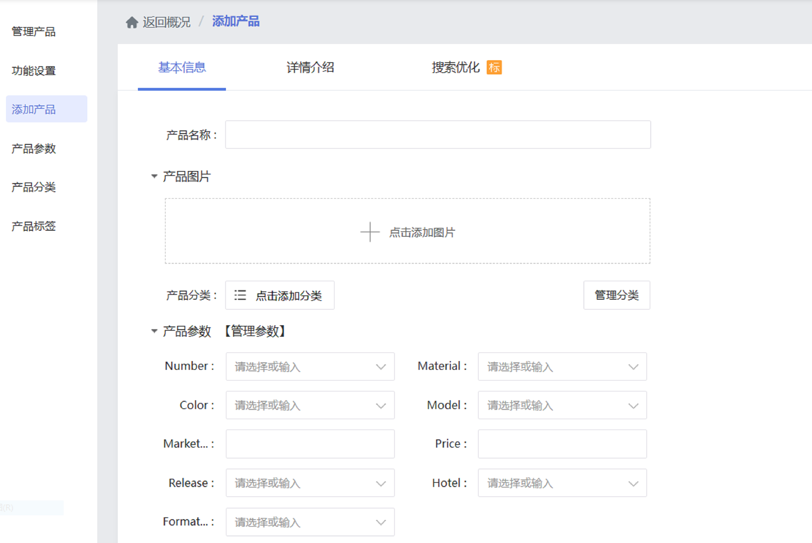 比方说,如果你想在官网上能够展示好公司的产品,那在“产品”板块中,咱们就可以对这些产品进行添加啦。你可以添加上关于产品的参数、详细介绍、照片等内容。