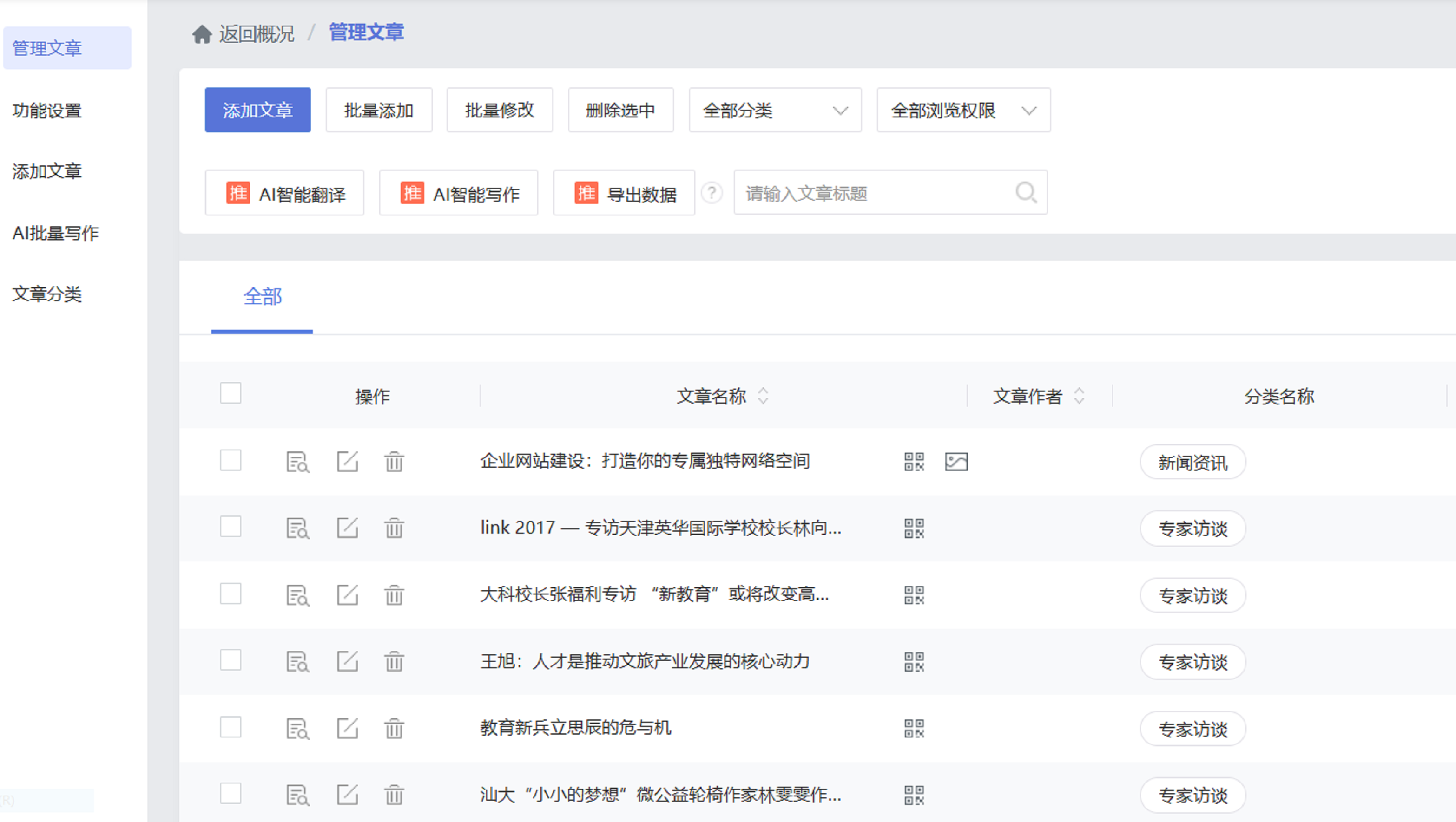 当然,咱们也能对发布在官网上的文章进行管理。大家可以直接在后台添加上需发布的文章。在发布完后,平台会列出已发布文章的详细表单~