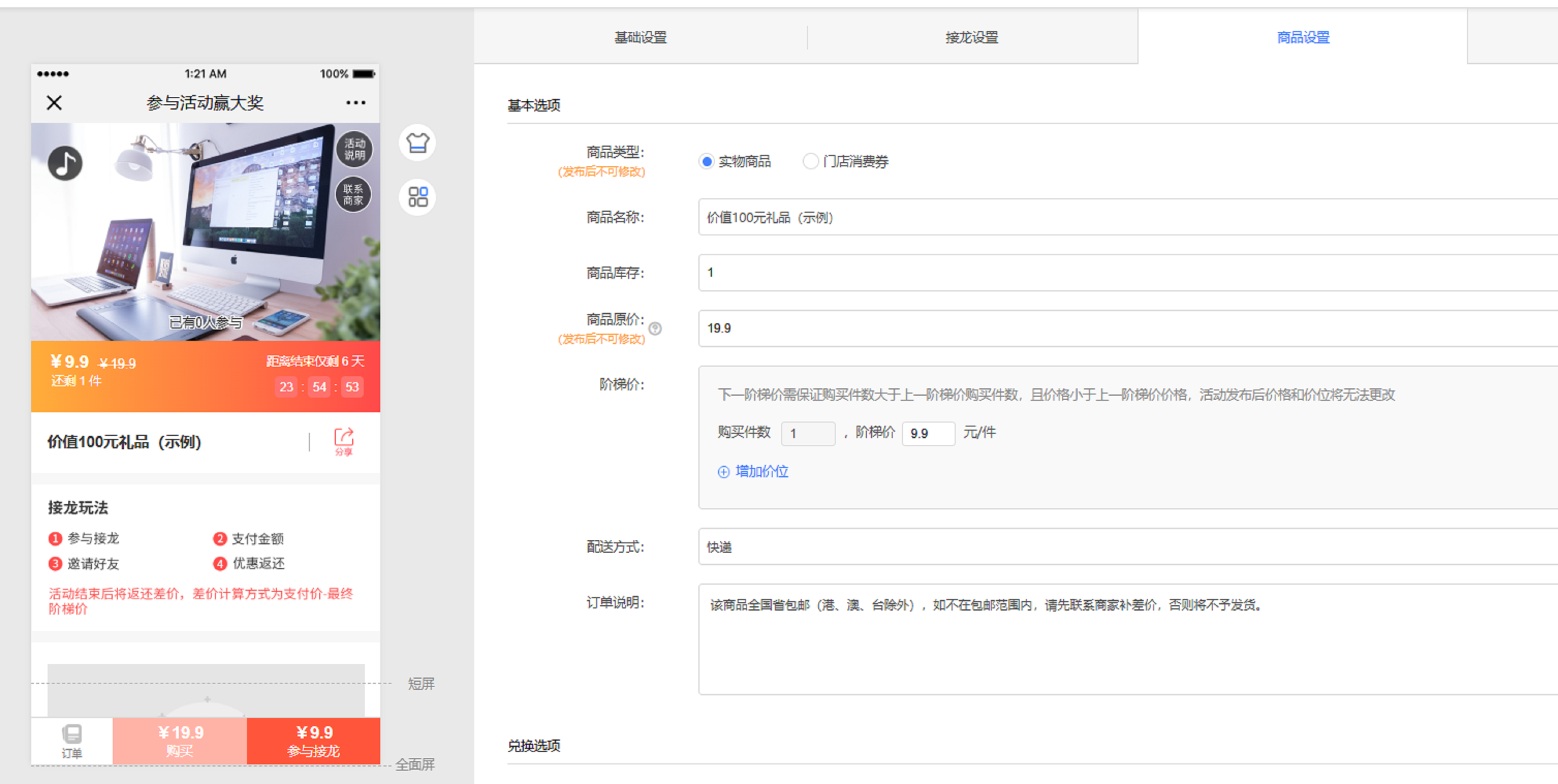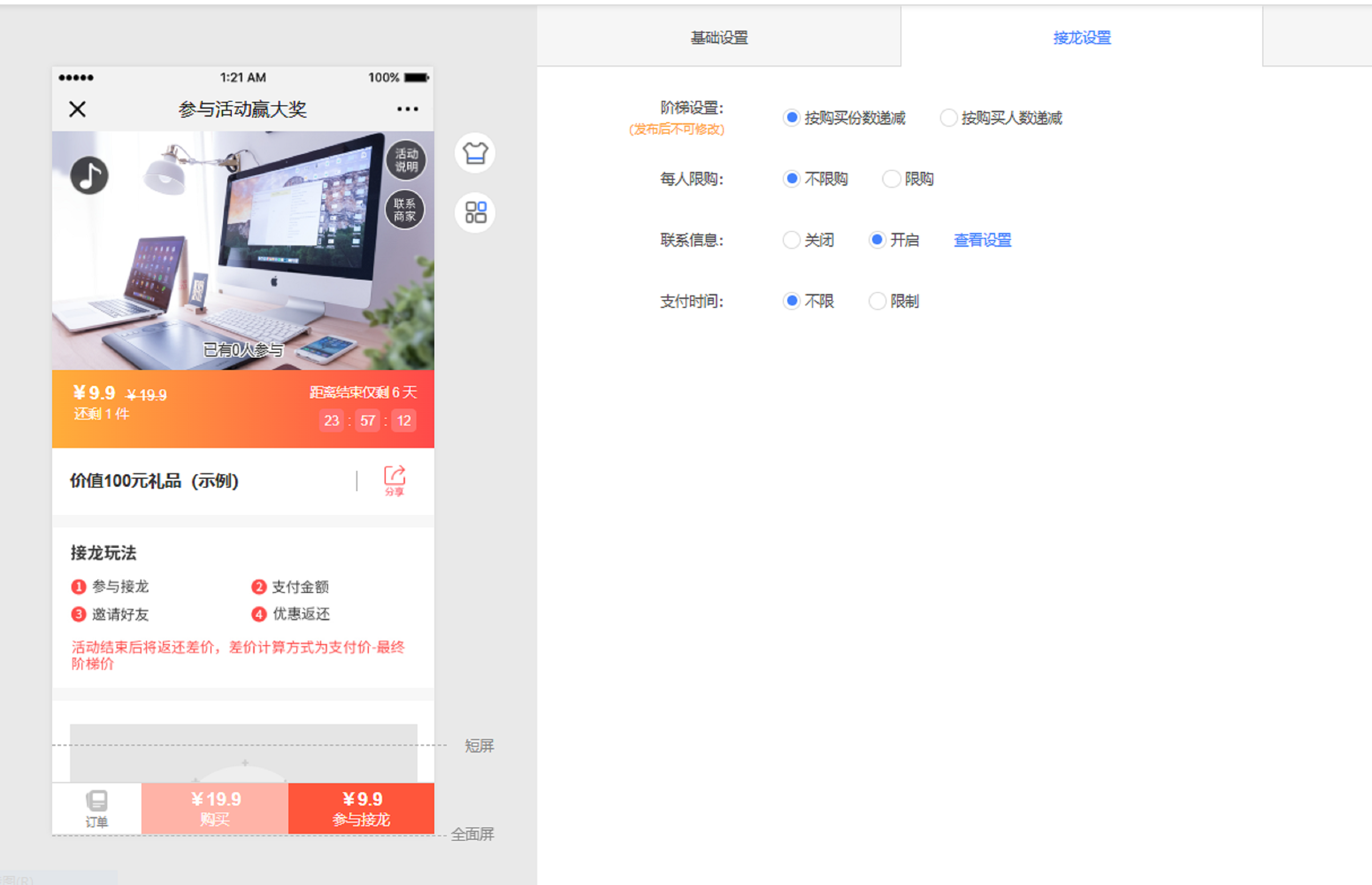 其次,在“接龙设置”中,有两种阶梯模式可以选择,分别是按购买份数递减或者递增。以及你也可以设置是否限购欧~