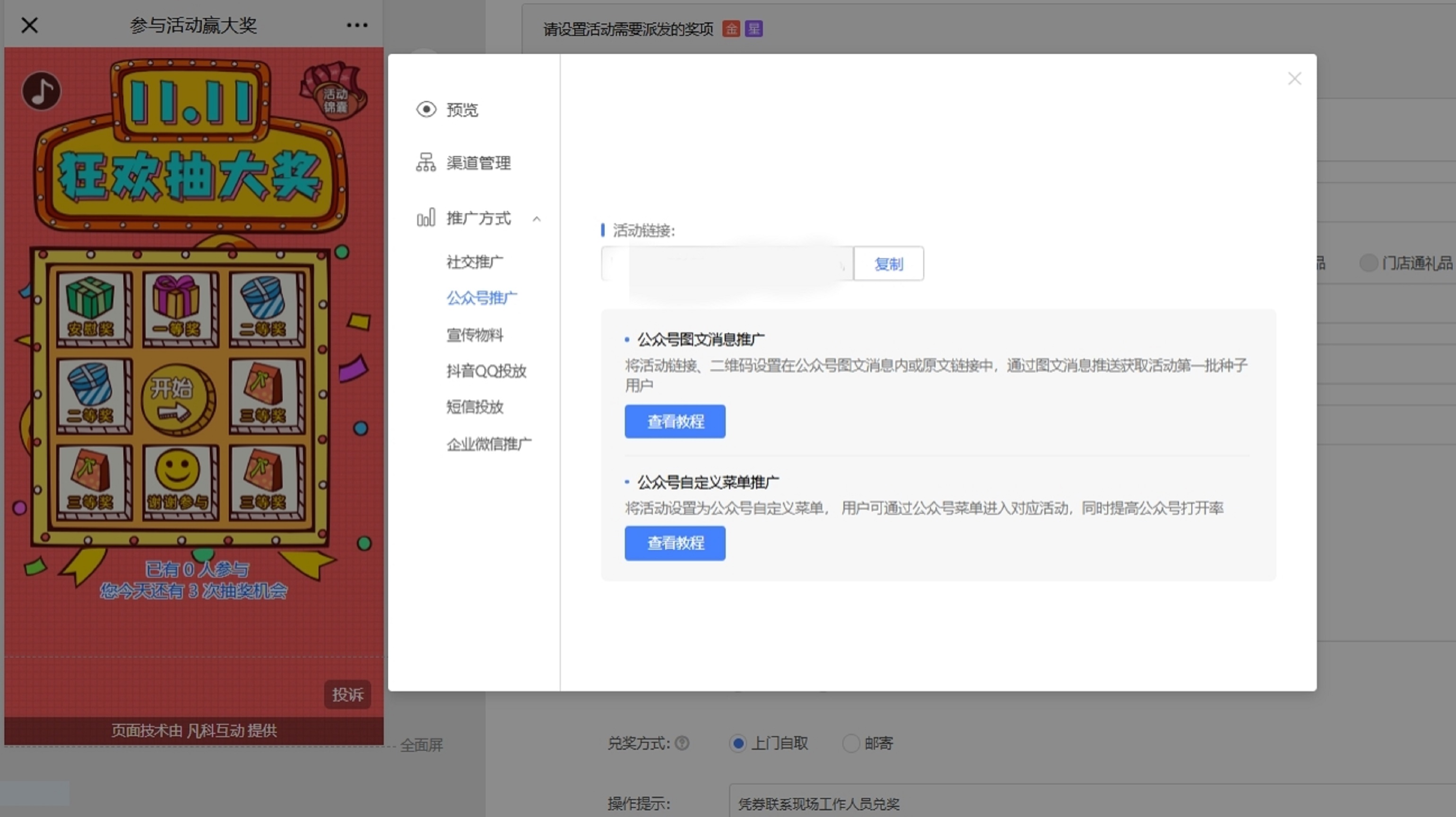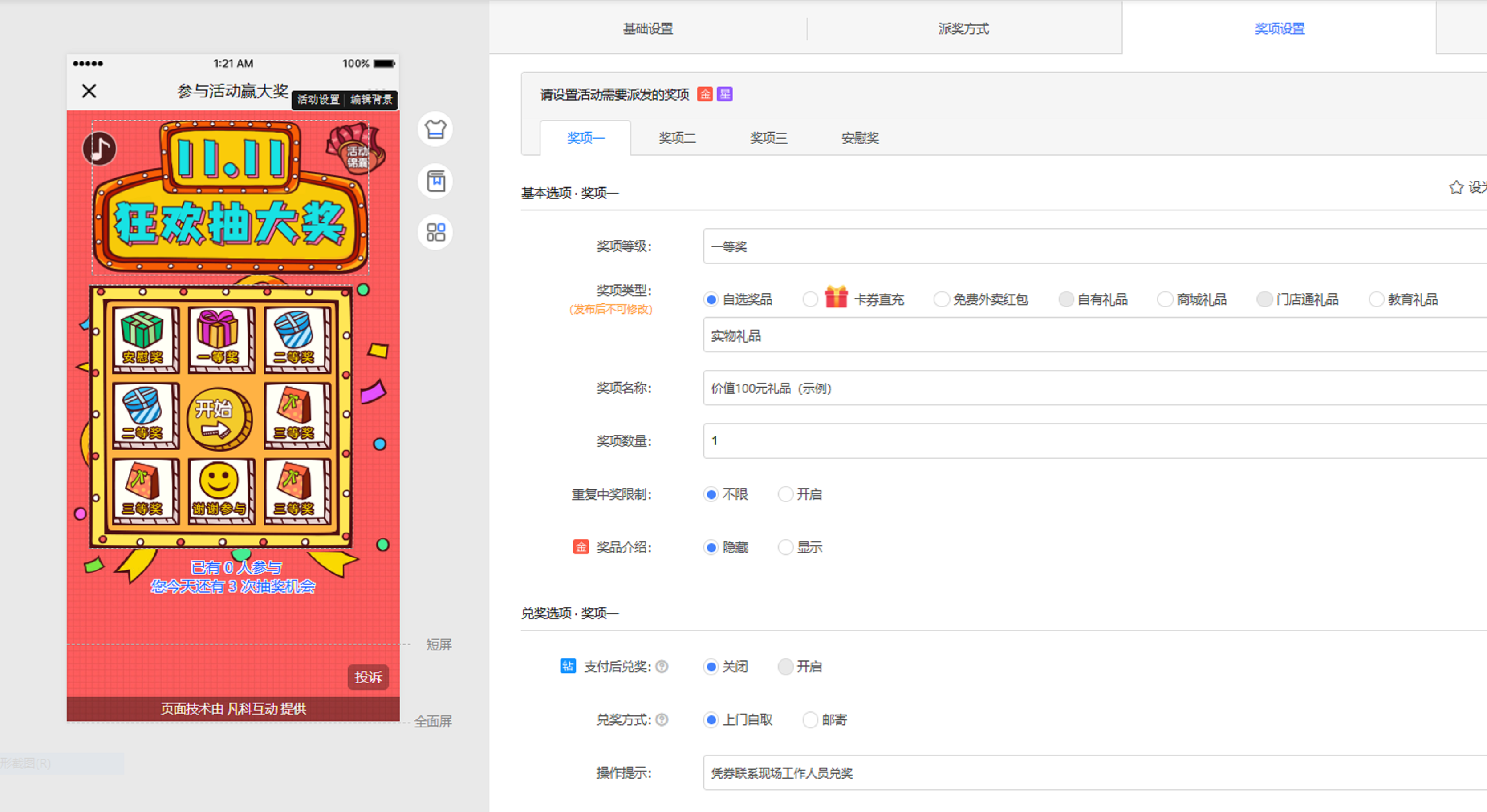 在“奖项设置”页面,大家能设置每个奖项的类型、等级、名称、数量等信息。以及,兑奖选项也可以一并设置啦。老板们可以选择兑奖的方式、兑奖地址等相关内容,以此确保活动办得有头有尾哇!