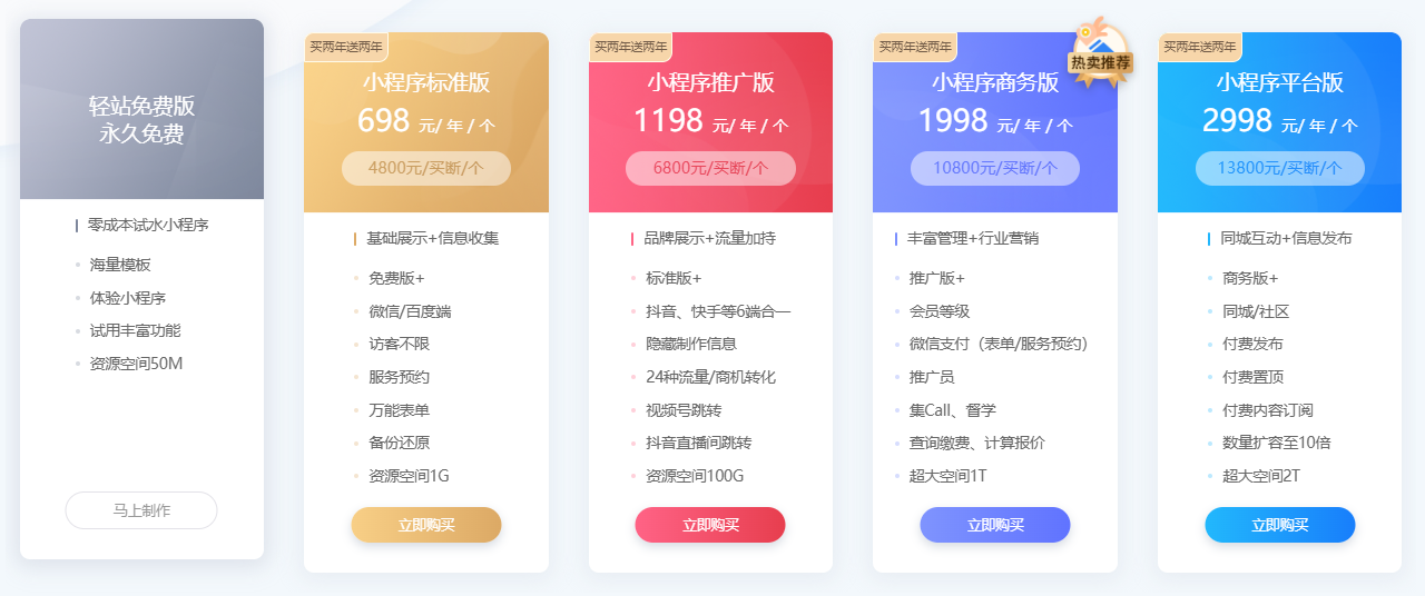 在价格方面,网站免费版支持用户进行试用,并推出不同阶梯的套餐供用户根据自己的需求进行选择,助力门店实现高效运营与业务拓展,下面是套餐的具体价格: