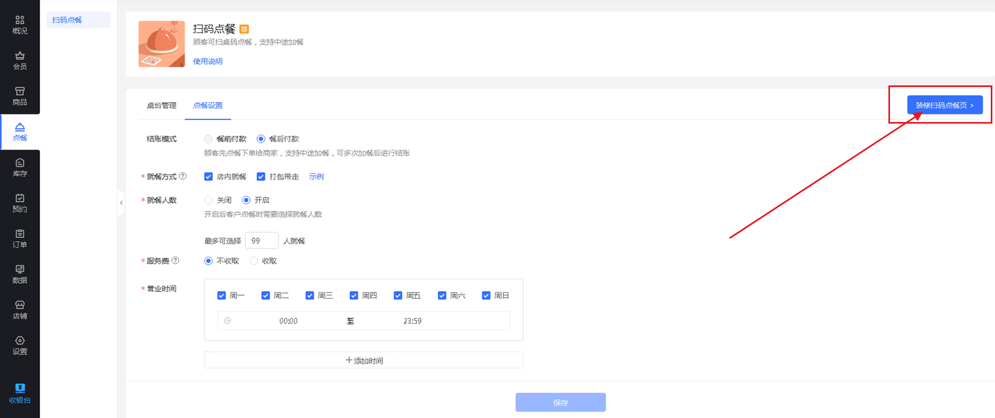 结账模式、就餐方式、就餐人数、服务费、营业时间