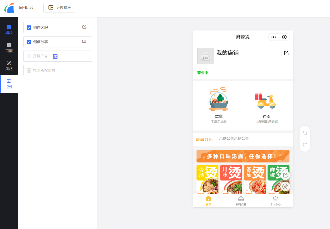 ,可跳转扫码点餐页的装修视图,商家可根据需要对“