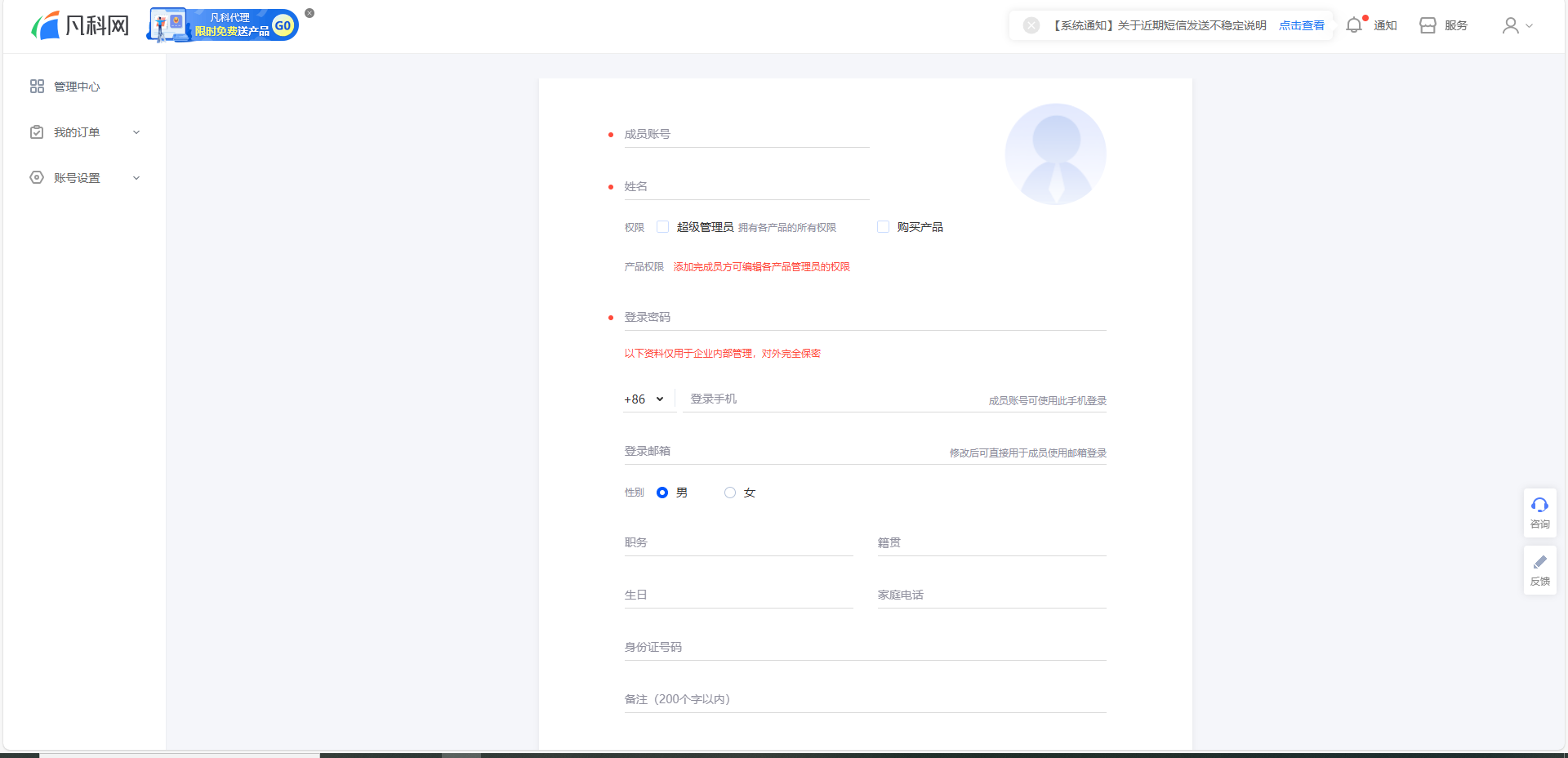 在这个界面,你可以输入成员的账号、姓名、登录密码、权限等信息。
