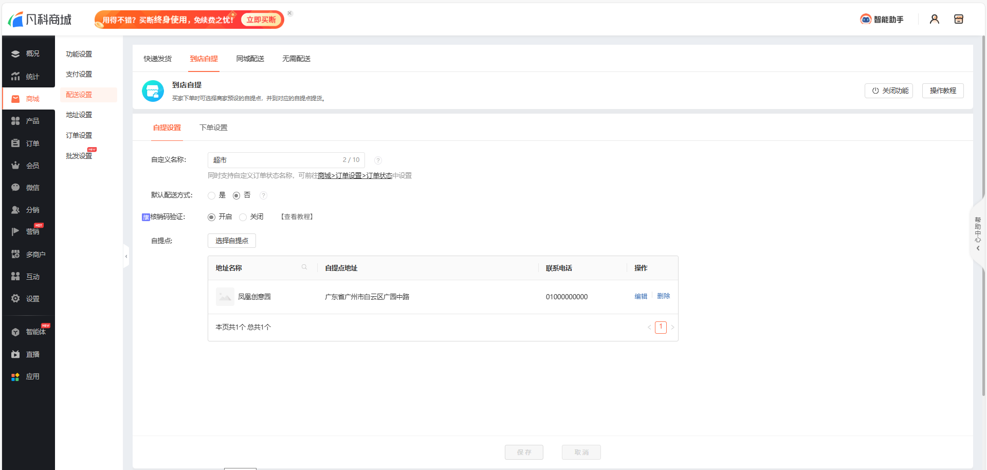 ”,设置好核销码验证、自提点,就一步就完成啦!