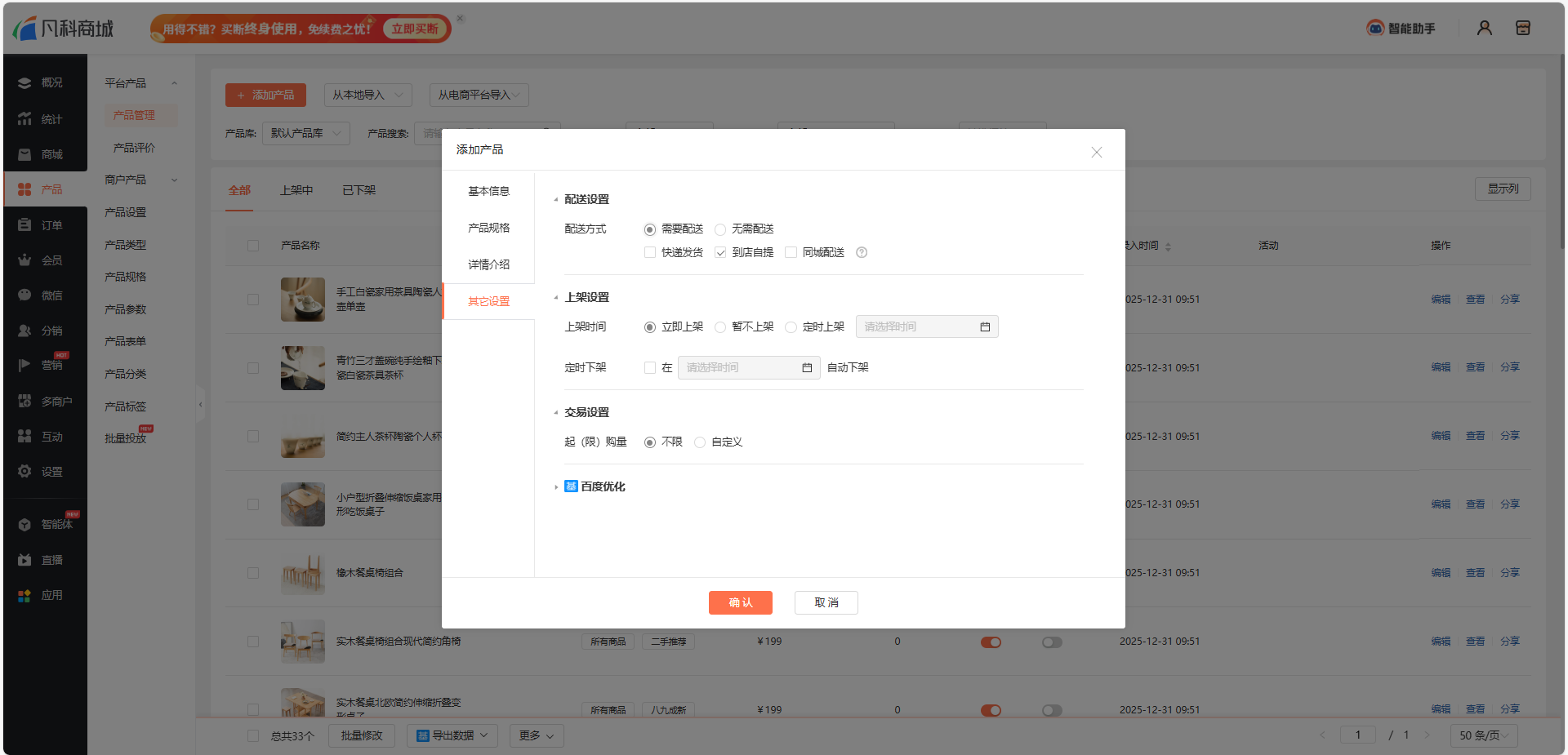 上传完商品之后,我们也可以对产品进行配送物流设置。我们可以选择