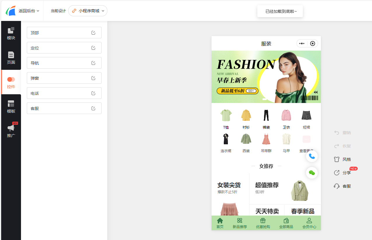 这款工具不需要从0开始搭建,我们直接在模板的基础上进行个性化设计就行了。我们可以添加导航、电话、客服等效果控件,可以在首页上传门店logo和