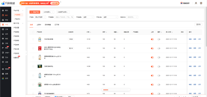 这个模块,我们可以手动添加产品,也可以批量导入。点击左上角的“