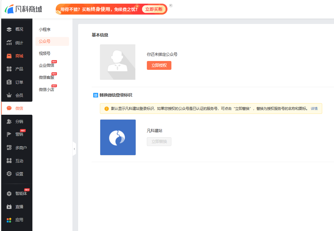 ”,然后扫码对注册好的公众号进行授权。如果你还没注册好微信公众号,那就得先去注册,一定要先注册好之后才能进行授权哟!授权完微信公众号之后,后续的微信支付对接、商城跳转都会自动打通,不用再单独操作。