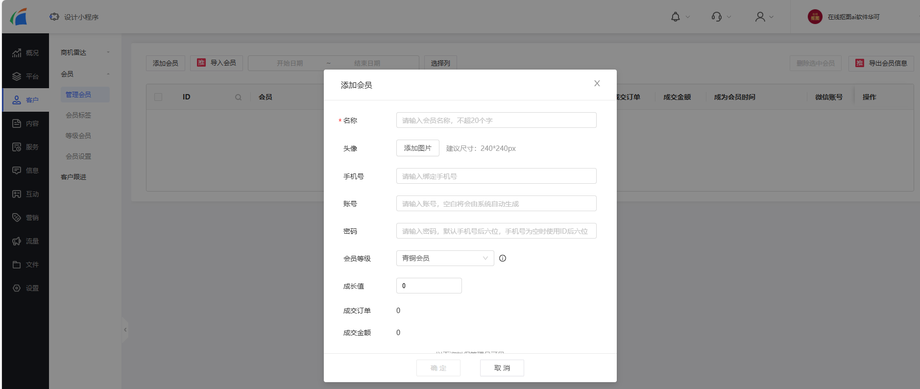 进入管理后台,我们点击“客户”这个模块,找到“会员”下面的“管理会员”这个标签页,点击左上角的“添加会员”,输入会员的名称、手机号、账号、密码等,还可以添加会员标签。