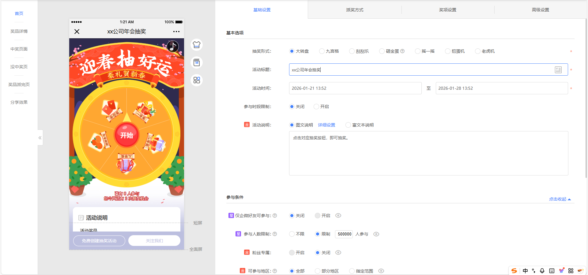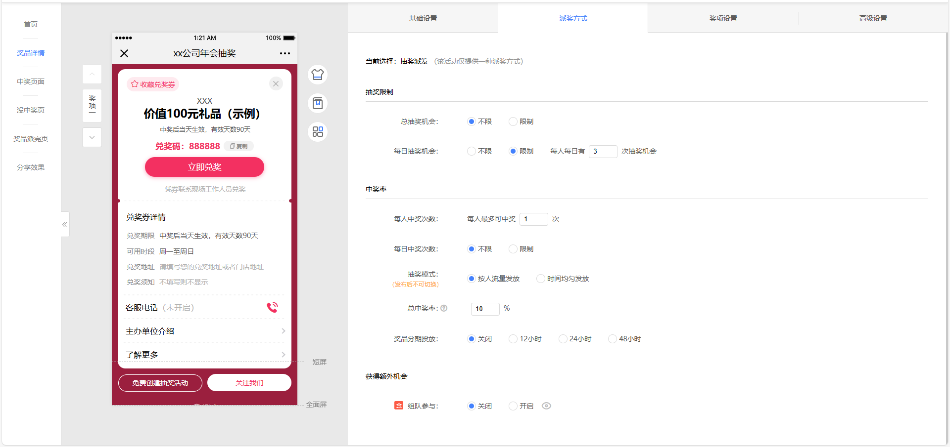 5、我们点击【派奖方式】这里,可以给年会抽奖小游戏做流程上的细化,比如【抽奖机会】设置每人抽奖次数、每人中奖次数;【中奖率】这里调整总中奖率,我们年会的中奖率可以提高点呀,让大家一起热闹热闹!还能设置【额外机会】只需点击开启组队参与,设置是几个人组成小队能获得抽奖机会,适合暖场环节带动员工互动哦。做完这些,基本上这个抽奖小游戏就完成大半了。
