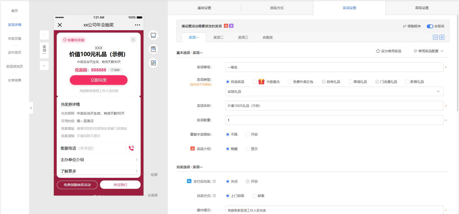 4、我们弄好基础信息后,就要来细化这个抽奖小游戏了,可以看到【奖品设置】这里。在这里就可以设置奖项的具体内容了,比如说【奖项类型】,这里已经准备好自选奖品、卡券直充、免费外卖红包等七个类型,你只需要根据你的实际情况进行修改就好,然后再设置好兑奖期限。