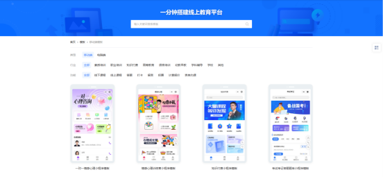 1、我们来到“凡科教育”的首页后,看到【导航栏--模版】就能看到平台准备好的海量模版了,我们挑选一个喜欢的,如果不知道选哪个,可以使用搜索栏进行搜索,帮你更快找到符合你要求的模版。