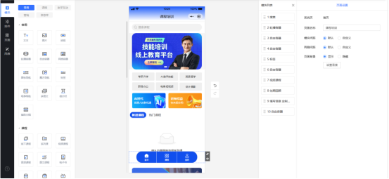 选完模版后,就进入装修页面啦,可以在这里修改小程序名称,按照自己的想法修改模板里的基础店铺信息,全程拖拽式操作就能完成功能搭建,比如设置“首页、课程、直播预告、关于我们、联系客服”等栏目,让使用体验更加好。