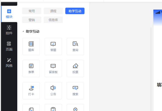 3、然后再弄点和学员互动的模块,提升互动率,增加用户粘性,我们可以在左侧的模块栏这里的【助学互动】里找一找符合自己的需求的模块,比如说增加一个“留言板”,学员有什么想说的都可以留在这里。