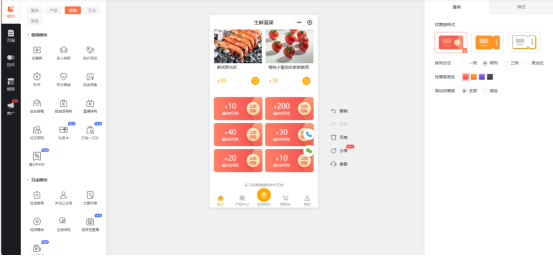 4、最后可以添加优惠券模块,在【模块--产品--营销模块】中选择【优惠券】,就能添加优惠券板块,鼠标移到优惠券图标上,点击编辑按钮,就能修改优惠券信息,还能限定使用时间、适用品类。