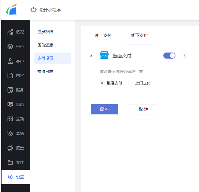 开启当面支付功能之后,我们选择“到店支付”,到店支付功能就成功开启啦!