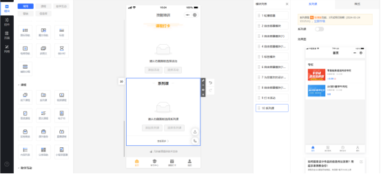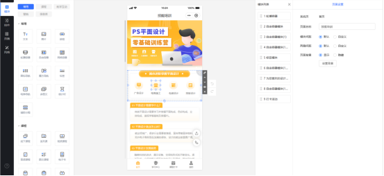 3、选择你需要的模板后,点击搭建,就能来到装修编辑界面了,可以在这里修改小程序名称,按照自己的想法修改模板里的功能模块,动动鼠标、敲敲键盘,全程拖拽式操作就能完成这些功能搭建,让学员的使用体验更加好。
