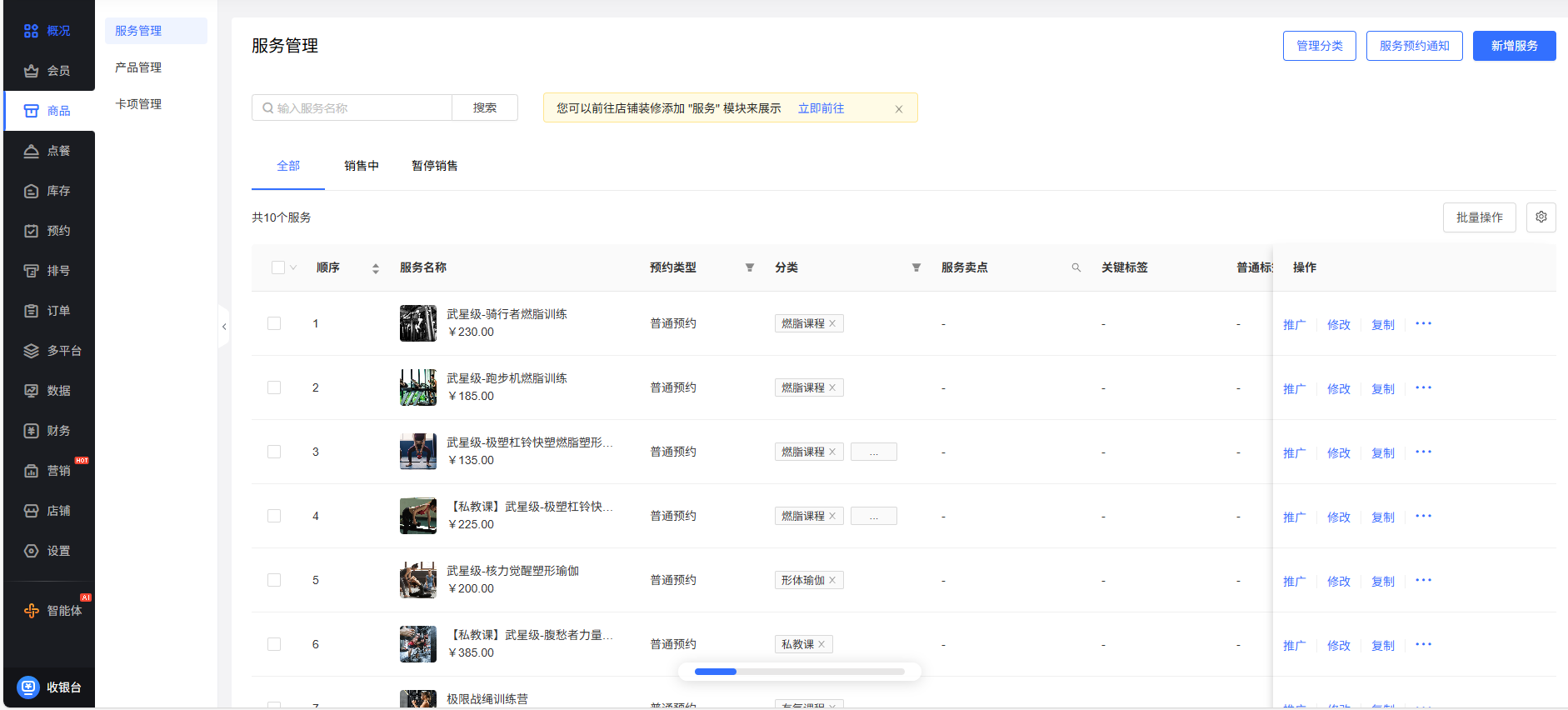 进入后台,我们点击“商品”-“服务管理”板块,添加课程项目,完善课程名称、课程时长、课程类型等信息,并设置好可预约时段和人数上限。配置完成后,用户就可以在小程序自主预约,我们在后台可以查看并管理预约记录,非常方便。