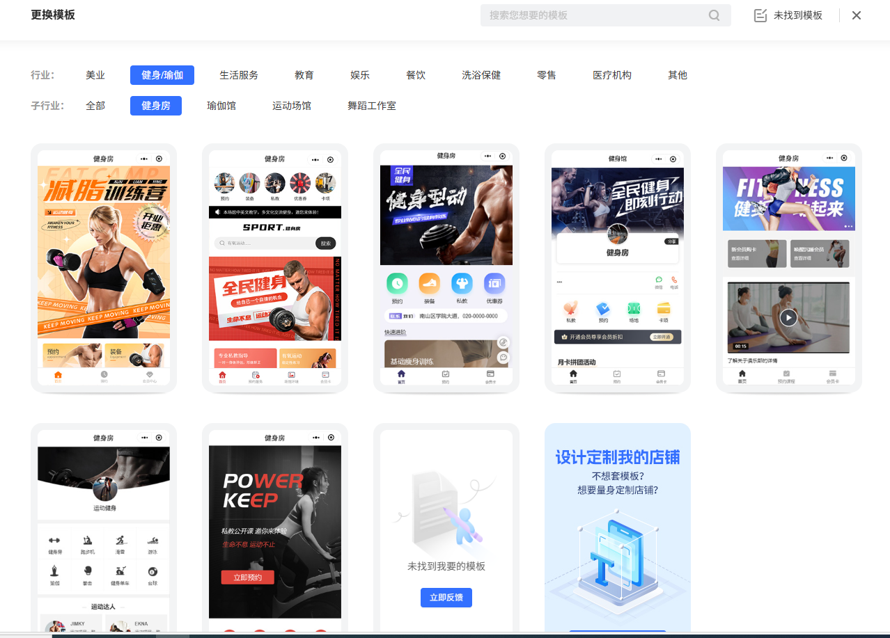 首先,我们打开盈建云门店通这个工具,根据指引完善店铺的相关信息,然后进入模板库,筛选“健身房”这个子行业,然后选择一款自己喜欢的模板就可以啦。