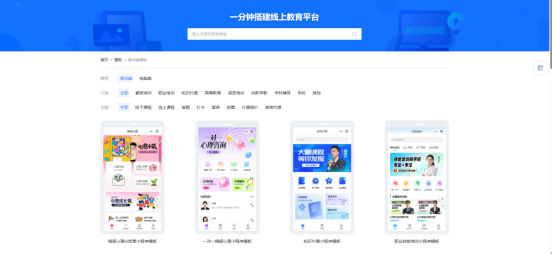 2、我们来到官网首页后,点击【导航栏——模版】就可以进入这个平台海量的模板库了,这里的模版有很多,适配不同的教育行业,根据你自己的需求进行选择,还可以点击行业、类型、功能或者在搜索栏里,输入关键词进行搜索,这样能快速定位,找到你需要的模板。
