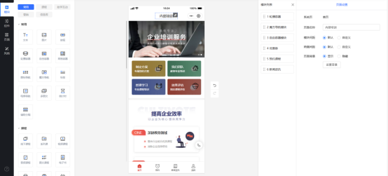 3、选择你需要的模板后,点击搭建,就能来到装修编辑界面啦,在可以这里修改小程序名称,按照自己的需求修改模板里的功能模块,动动鼠标、敲敲键盘,全程拖拽式操作就能完成这些功能搭建,方便且高效。