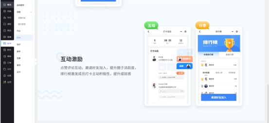 3、我们可以检查一下现有模板的功能是否满足你的需求,如果觉得还能添加一些功能,比如说我们今天提到的“每日交作业小程序怎么布置作业”,我们看到左侧的操作栏里的模块,选择【助学互动】这里有一个【打卡】功能,我们可以选择添加活动,然后把要交的作业布置上去,这样就能在这里收作业了,还可以创建学习打卡互动圈子,督促练习和学习。