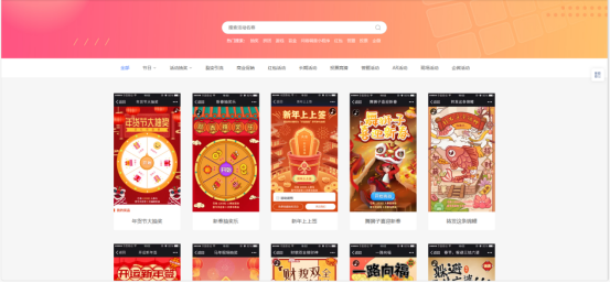 2、我们来到平台首页,看到网页上方的【导航栏——模板】并且点击,就能进入模板库了,模板库里的模板有很多,有着不同活动的模板,选择一个符合你需求的模板。如果想快速定位相关模板,可以选择在搜索栏里输入关键词,点击搜索,这样就能显示出与关键词相关的模板啦,帮助你更快做出选择。选好后我们就可以点击模板进行搭建了。