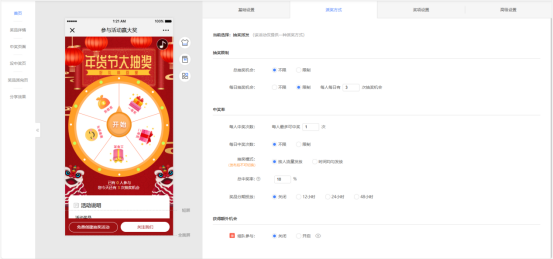 6、我们接着来点击【派奖方式】,可以在【抽奖机会】中设置每个人的抽奖次数、中奖次数,在【抽奖率】这里可以调整总中奖率,在【额外机会】里可以点击组队参与,让更多人参与其中。此外,你还可以在【高级设置——安全设置】里设置防刷,能识别异常账号,保障活动的公平性。