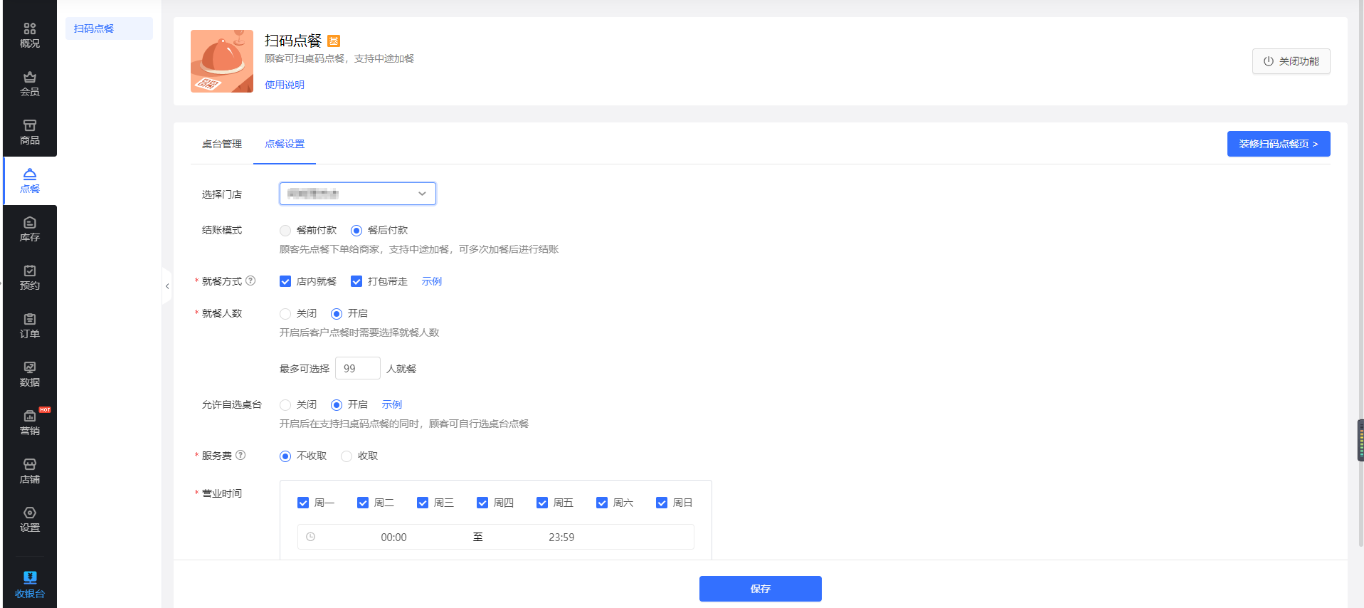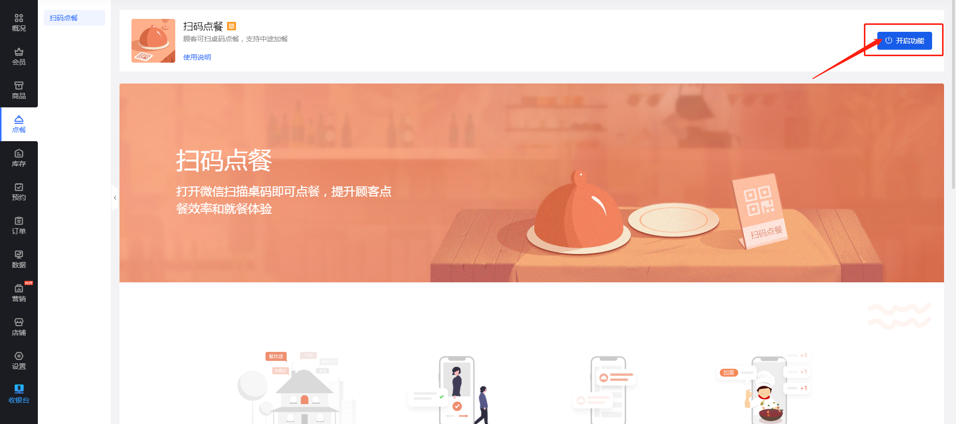 我们点击“点餐”-“扫码点餐”标签页,点击开启功能,扫码点餐功能就成功开启了。
