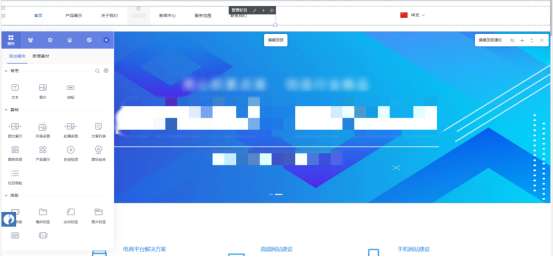 3、我们选择好模板后,就可以点击【搭建】啦,之后我们就进入了设计编辑页面了,可以开始搭建了,这个搭建方式很简单,我们动动鼠标点击或者拖曳式操作,根据你的需求,把需要的模块拖入页面中。我们还可以对现有模块进行更改,敲敲键盘修改模块中的内容,设置好网站的标题、LOGO,让这个网站更符合你的需求。假如你想做外贸,还可以设置语言导航,方便你业务的展开。
