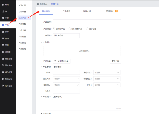 4、外观设计做好后,我们进入后台进行设置,点击左上方的【网站管理】就能进入后台了。企业网站有一个很重要的作用就是展示产品,我们把产品添加到网站里,专业客户就可以浏览企业的产品信息,我们在【产品-添加产品】中进行添加产品,写好产品名称,选择好产品类型,填写好产品规格、详情介绍,还可以添加上图片,这样让客户能更直观地了解你的产品。