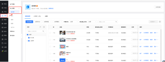 现在我们来设置线上课程,点击设计编辑页面左上角的【管理后台】,来到后台后点击【课程——线上课程】可添加系列课、图文、音频等课程内容。今天小编就用【系列课】来做课程内容,我们开启【系列课】,可以添加专栏、体系课程、训练营三种不同的课程类型,然后设置好课程的基础信息、课程模式等内容,设置好后保存即可。