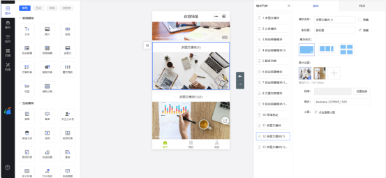 3、接着我们来完善小程序里的功能,我们可以添加【图文模块】展示多张图片,比如企业文化、门店环境介绍等,在模块栏里点击【常用——多图文】然后选择图片,还可以选择直接上传进行图片添加,我们在右方的模块编辑栏进行设置,【模块样式】可以选择三种不同图文展示样式;【图片展示】调整图片排列顺序;如果需要给图片添加上链接,就选中该图片并【设置链接】。
