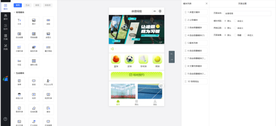 2、选择好你需要的模板后,我们点击搭建就来到了编辑设计页面,左侧是模块栏,右侧是模块编辑栏。我们先对小程序进行外观设计,修改小程序名称、图标、页面颜色等,让小程序更有辨识度。