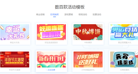 在活动市场,挑选你自己喜欢的抽奖模板,大转盘、刮刮乐都可以,搭建起来一点不麻烦