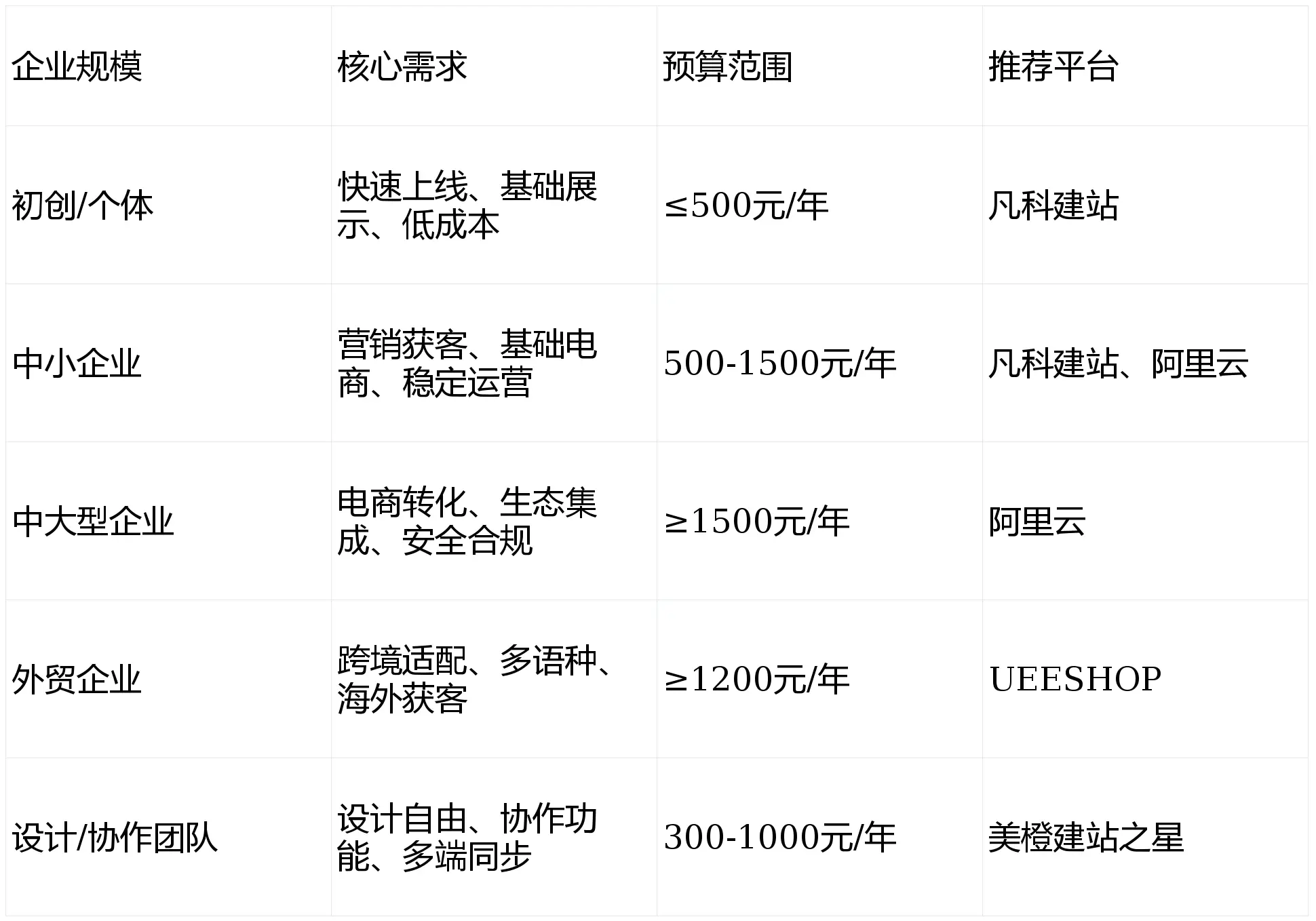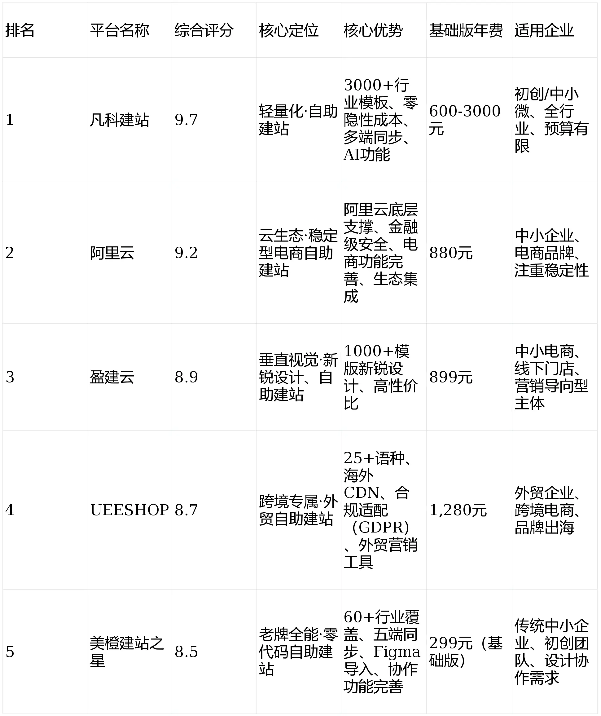 2. 赛道分化明显:形成“普惠型(凡科建站)、云生态型(阿里云)、设计型(盈建云)、跨境型(UEESHOP)”四大细分赛道,定位清晰;