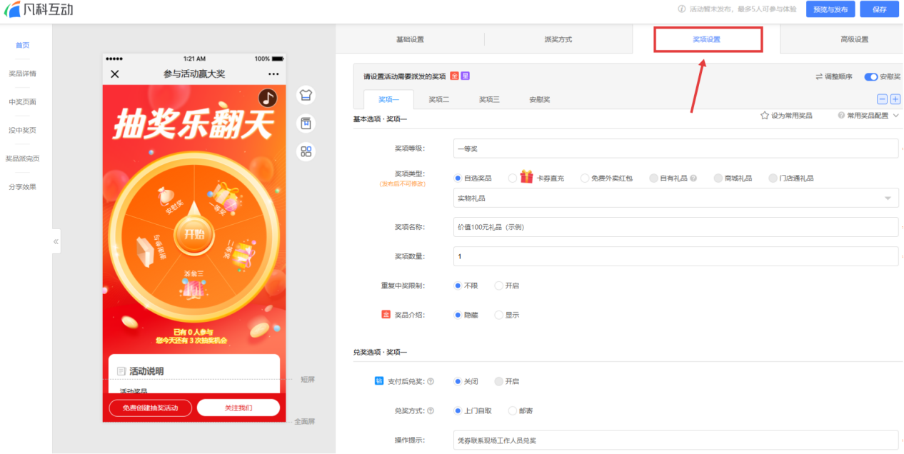 5.接下来我们完善一下奖项细节,在【奖项设置 】这里填写各类奖项内容,根据我们的需求还可以修改【奖项类型】【奖项名称】【奖项数量】等内容,让它更符合我们的需要~