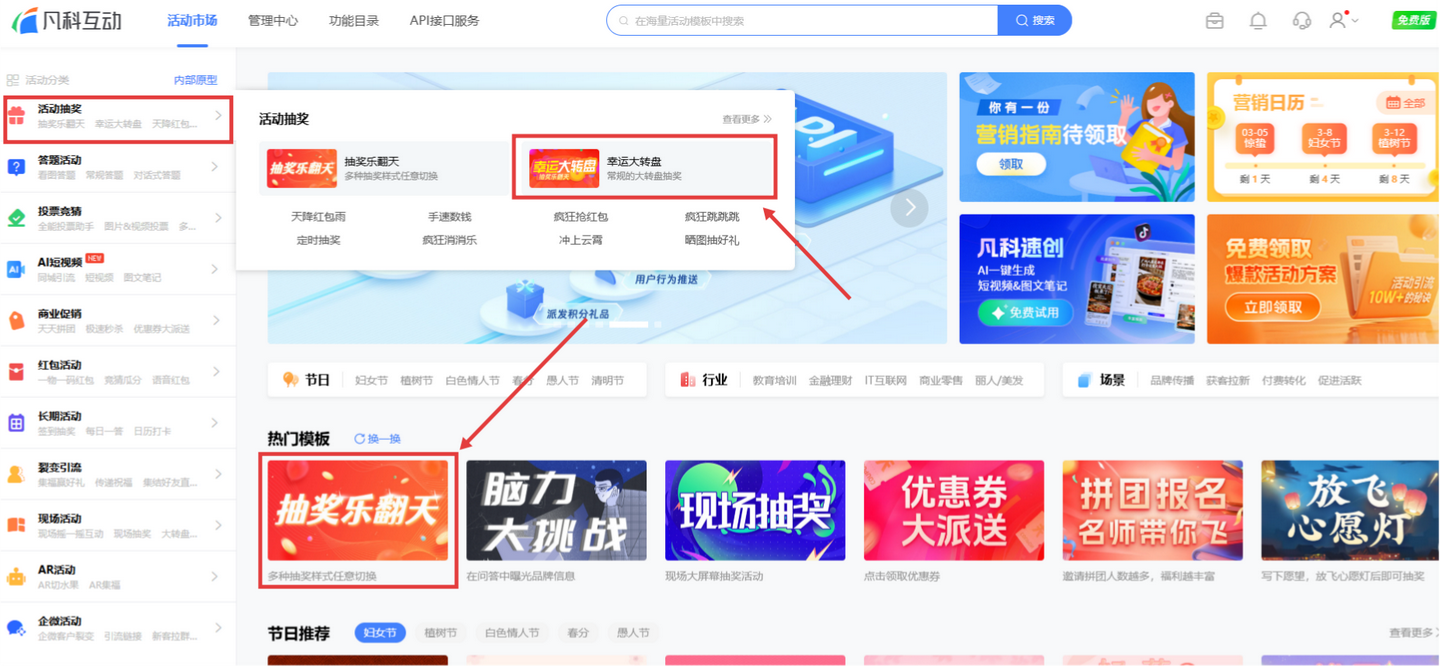 3.在【活动抽奖】这里就可以看到我们想要的转盘抽奖小程序的模板啦~在网站这边我们也可以看到热门模板里也有相应的抽奖模板,所以大家根本不用担心找不到,轻松搞定转盘制作~