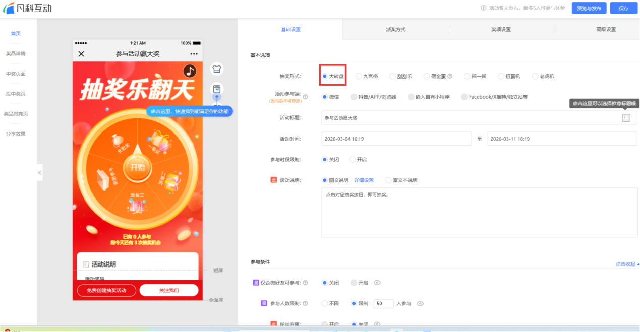 我们编辑一下基础信息,在右侧的编辑栏里找到【基础设置】,修改活动标题、时间等内容。抽奖方式选择我们的转盘形式就好啦~