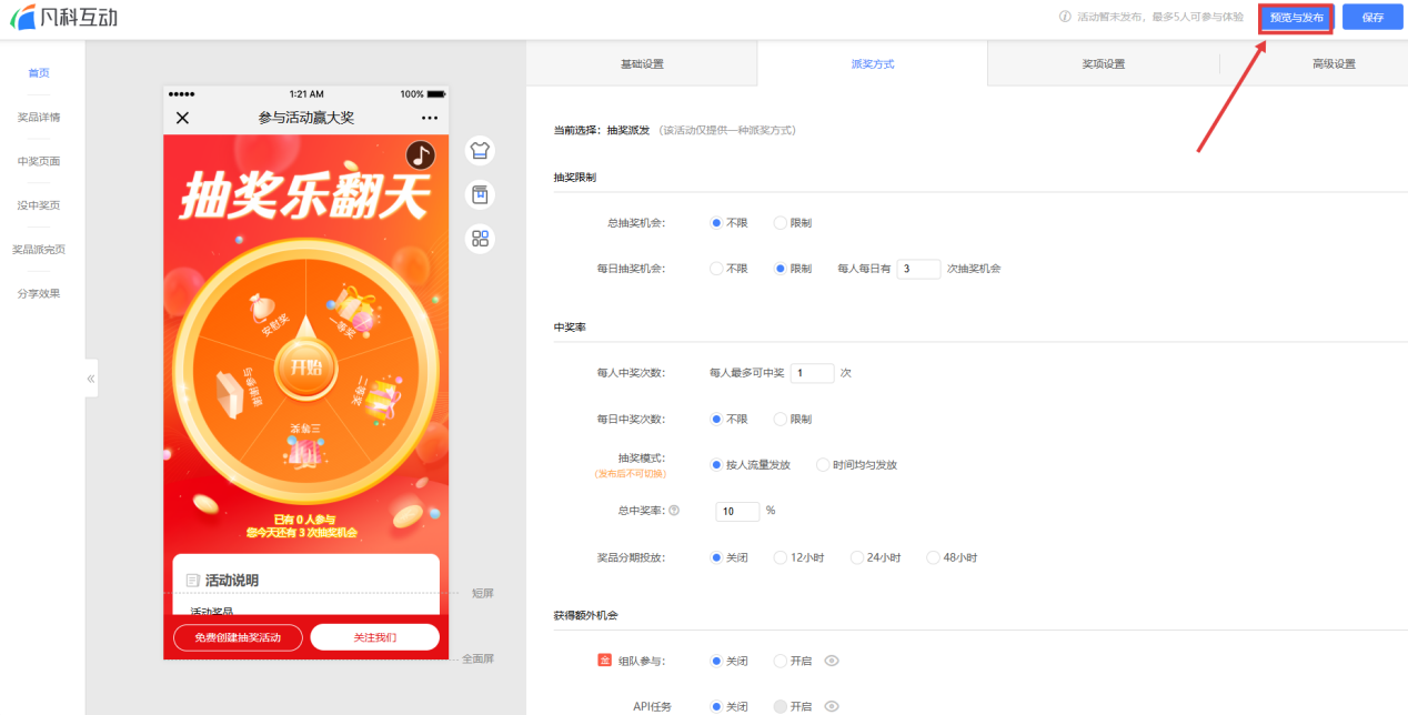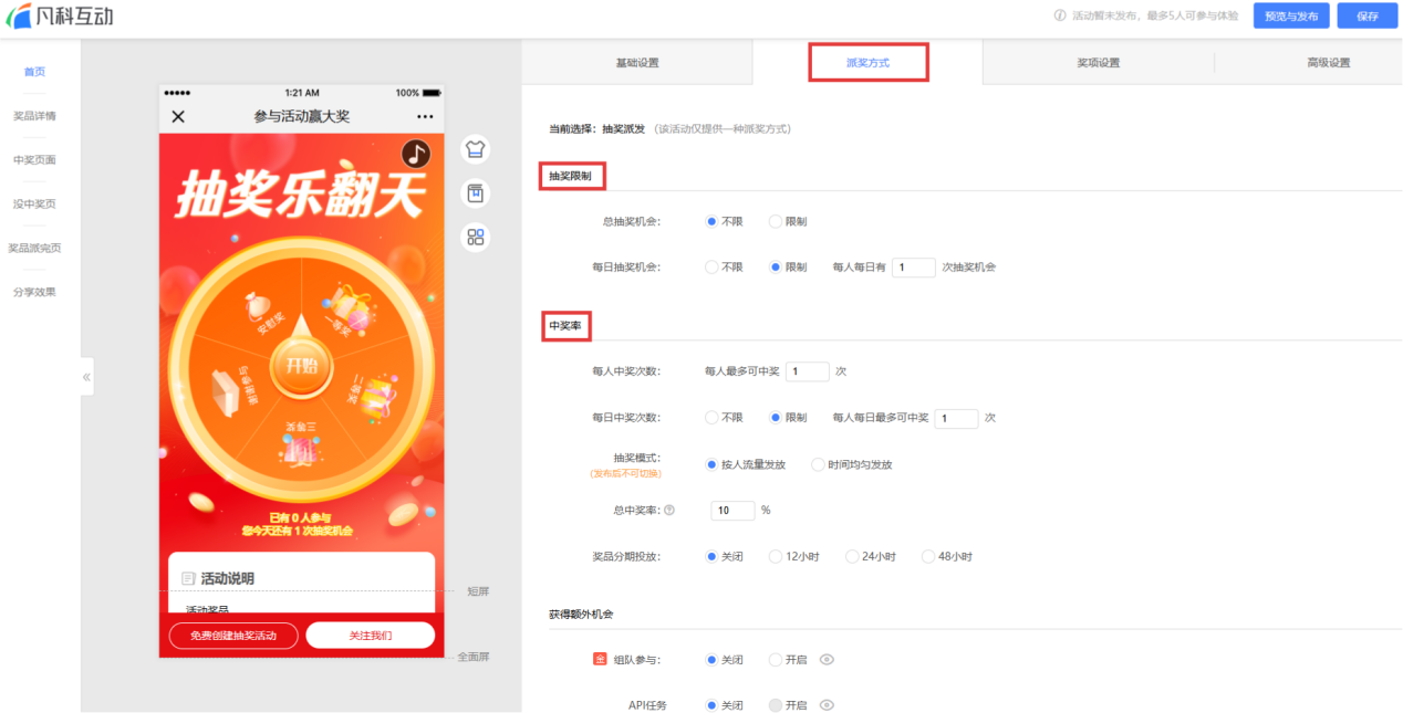 6.然后我们可以设置【派奖方式 】,根据我们的需要可以在【抽奖限制 】设置一个人的抽奖次数、中奖次数,在【中奖率 】设置相应的中奖率。另外还可以在【额外机会】设置是否开启,如果开启的话,可以选择组队参与,让更多人参与到我们的抽奖活动当中。此外,还可以在【高级设置——安全设置 】里进行防刷设置,这样可以保障我们抽奖活动的公平性~