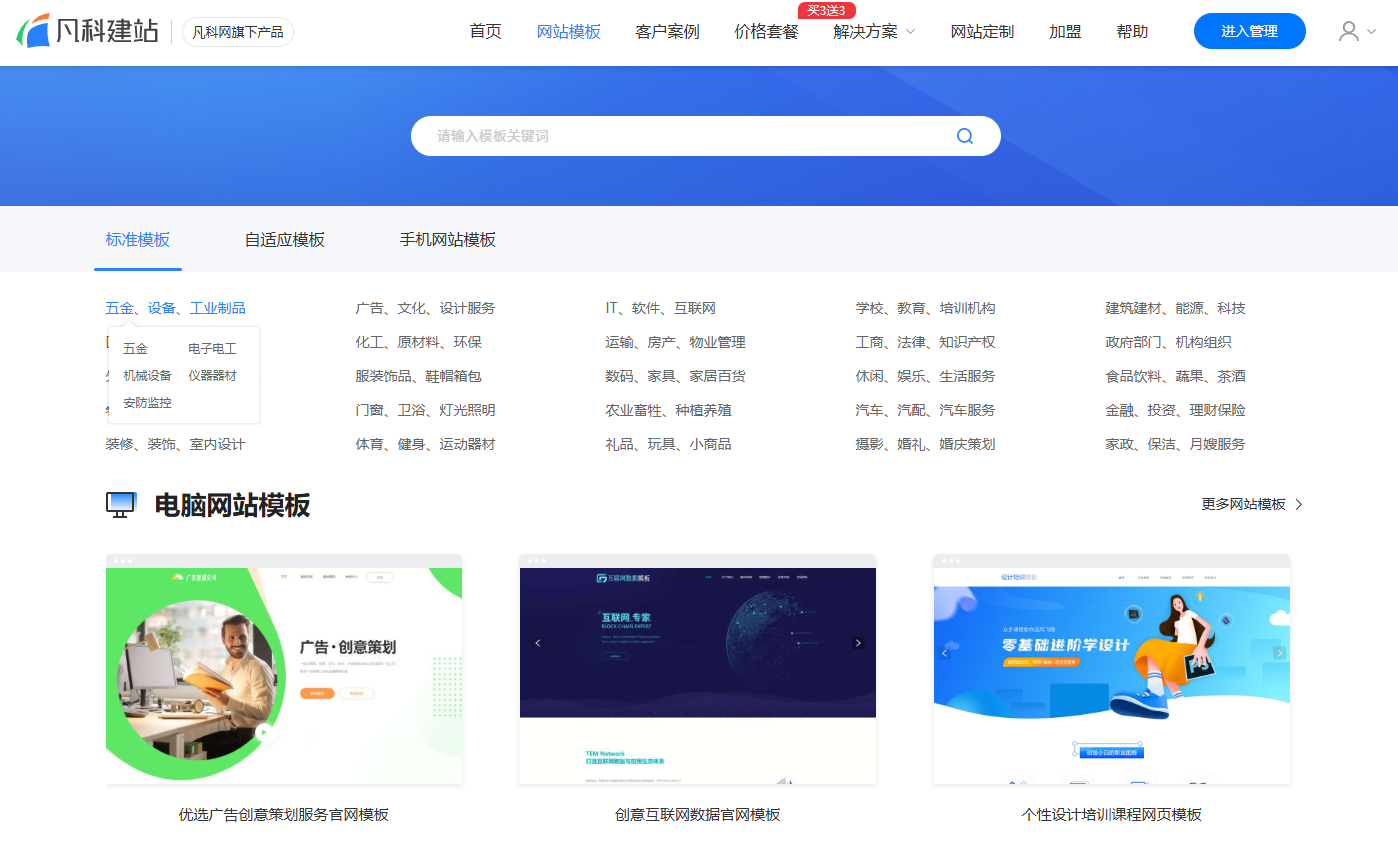 1.第一步选用模板,模板覆盖各行各业。网站模板类型还包含自适应网站。自适应网站在标准网站的基础上,更适用于多设备,自动适应不同大小的屏幕,有效降低制作成本和维护成本。让大家用着放心。