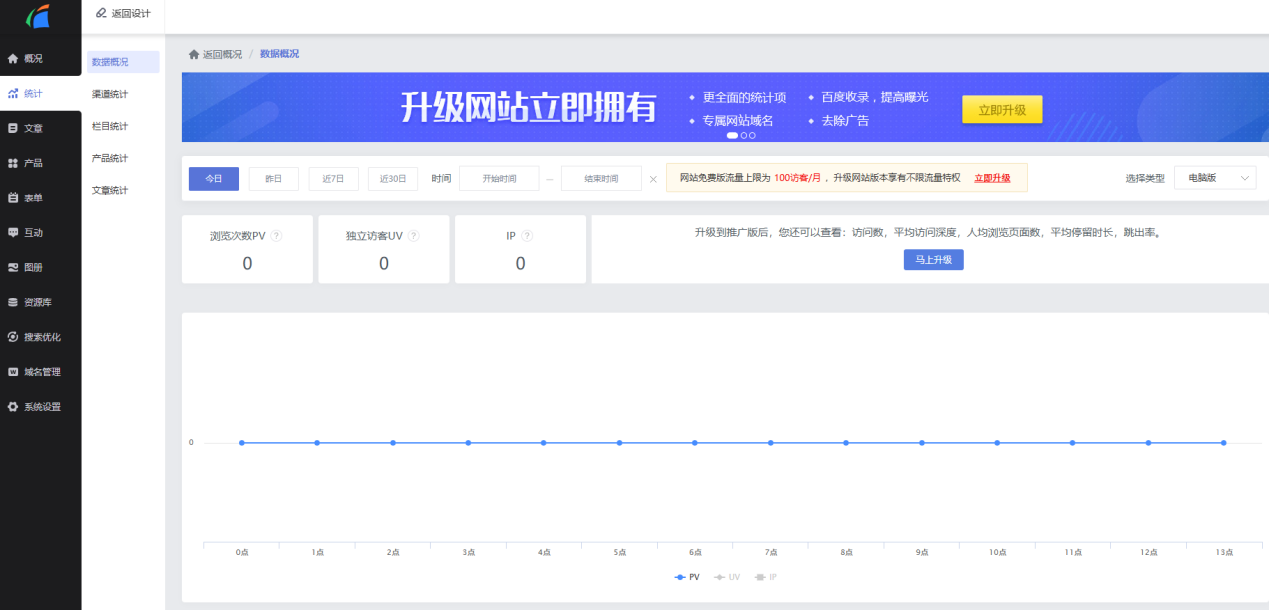 3.最后一步进行网站管理,例如文章、产品、系统等管理。例如,如果我们需要统计网站的各项数据,就可以在【统计】这一模块进行管理。