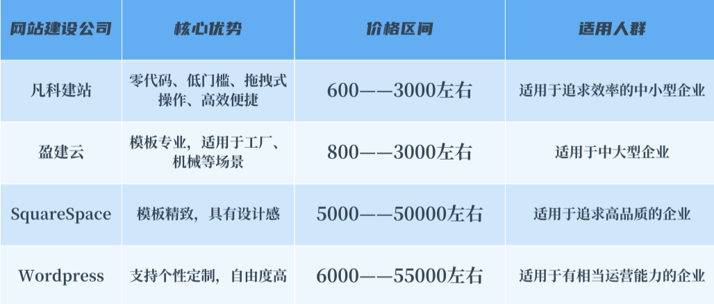 前两个国内的网站建设公司(凡科建站和盈建云)是更具性价比的网站搭建公司,已经很好的满足了我们的需求。