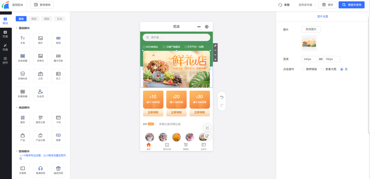 第二步:在模板基础上,根据门店自身的实际需求灵活进行店铺装修,自由替换门店实景图、门店产品图以及门店专属logo等元素,还能按需添加门店公告、门店客服等模块,让小程序更贴合门店特色。