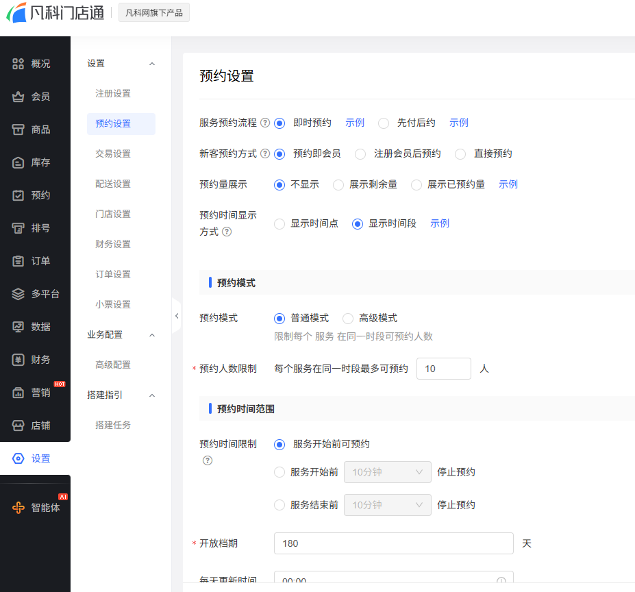 第三步,也是最重要的一步:在设置界面中找到预约设置,根据门店运营规划来完成想要的预约设置,可按需设置预约的流程、方式、人数限制等,满足门店运用的实际需求。