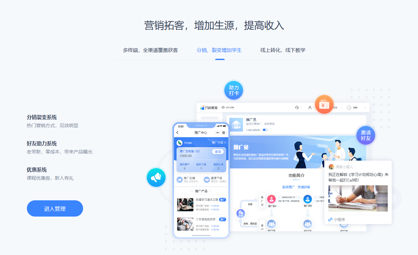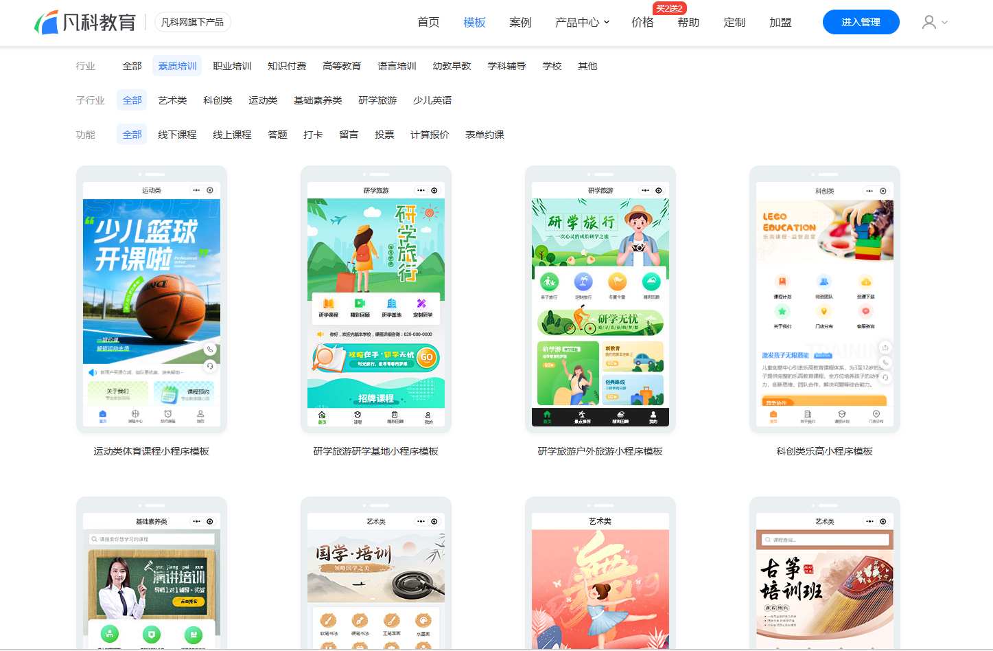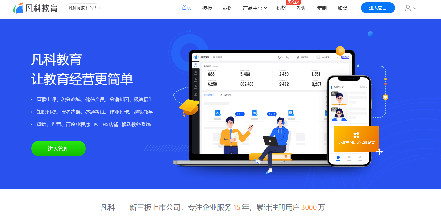 凡科教育是国内知名的SaaS教育搭建平台,覆盖“教学练考评”全流程,该平台教育系统完善,支持图文、语音、视频等多类型的教学形式,还配有海量题库满足多样化教学需求。拥有200+精美模板,一键套用,零代码低门槛操作,无需编程,拖拽点击即可搭建,新手也能快速上手。适用于有一定规模的重视教学质量的教育企业,价格在1900——4000元左右。