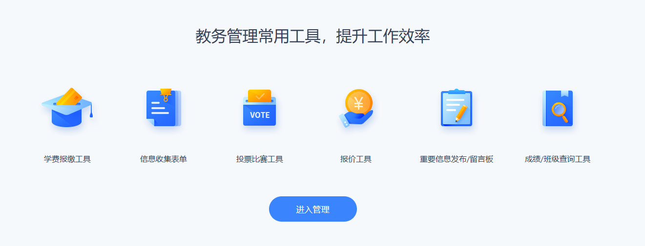 杰建云配备了学费保教、成绩查询、投票比赛等一系列教务管理常用工具