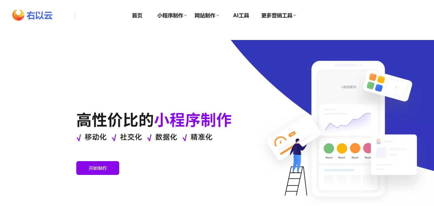 右以云是一个知名的小程序制作平台,主打高性价比小程序制作。平台配备有在线客服,能及时回复你的售后问题,为你提供使用指南。实时监控后台数据,有强大的技术支持和保障。
