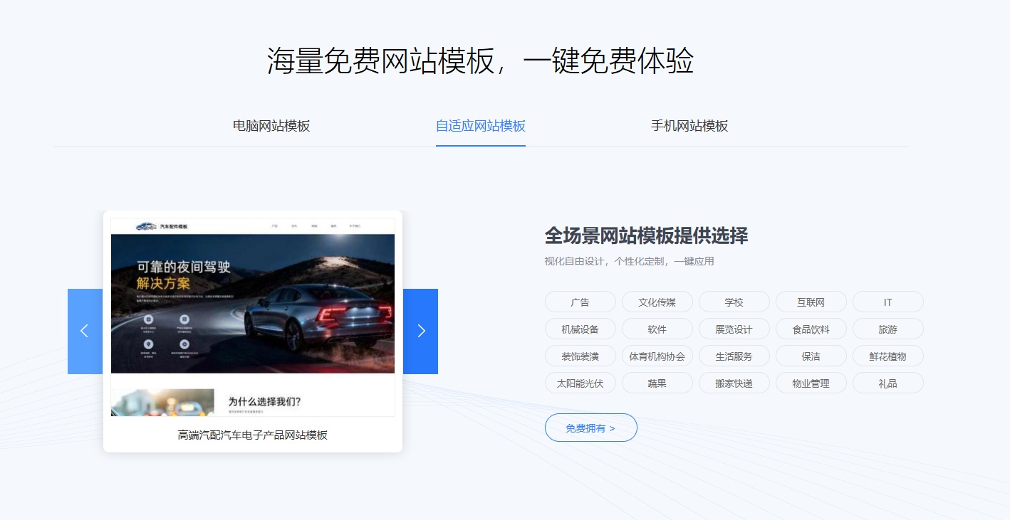 这是一个国内高人气网站搭建平台,拥有200+精美模板,分类超全,从汽车、IT、电商、生活服务等各行各业都能精准匹配。模板页面设计精美,简约大气,还能自行更换图片、文案等元素,满足企业的多样化需求。
